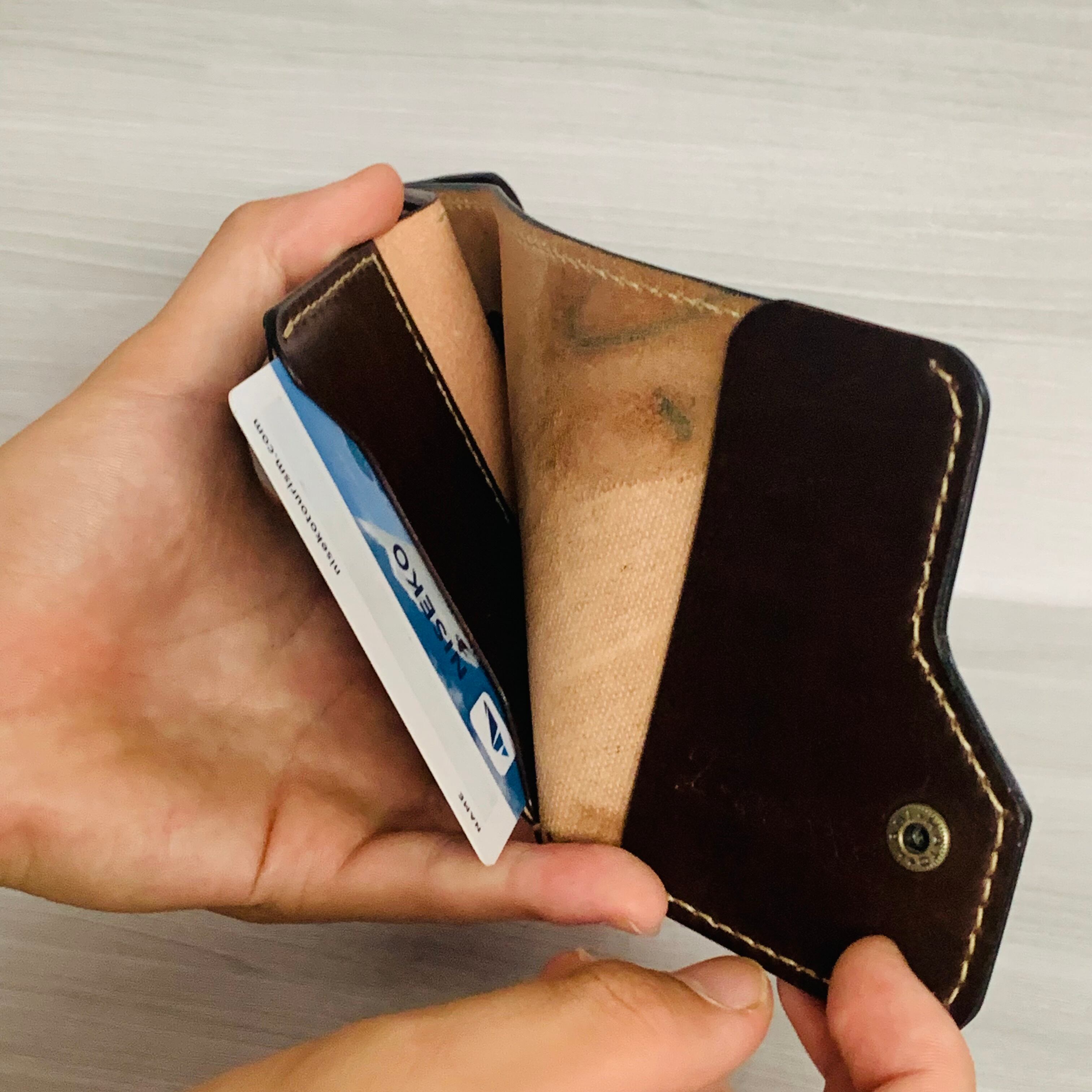 外装はT-woRks シグネイチャーカラーであるRecollectionにて染め上げた馬革を使用。馬革は軽量な上に強く財布には最適な素材です。
