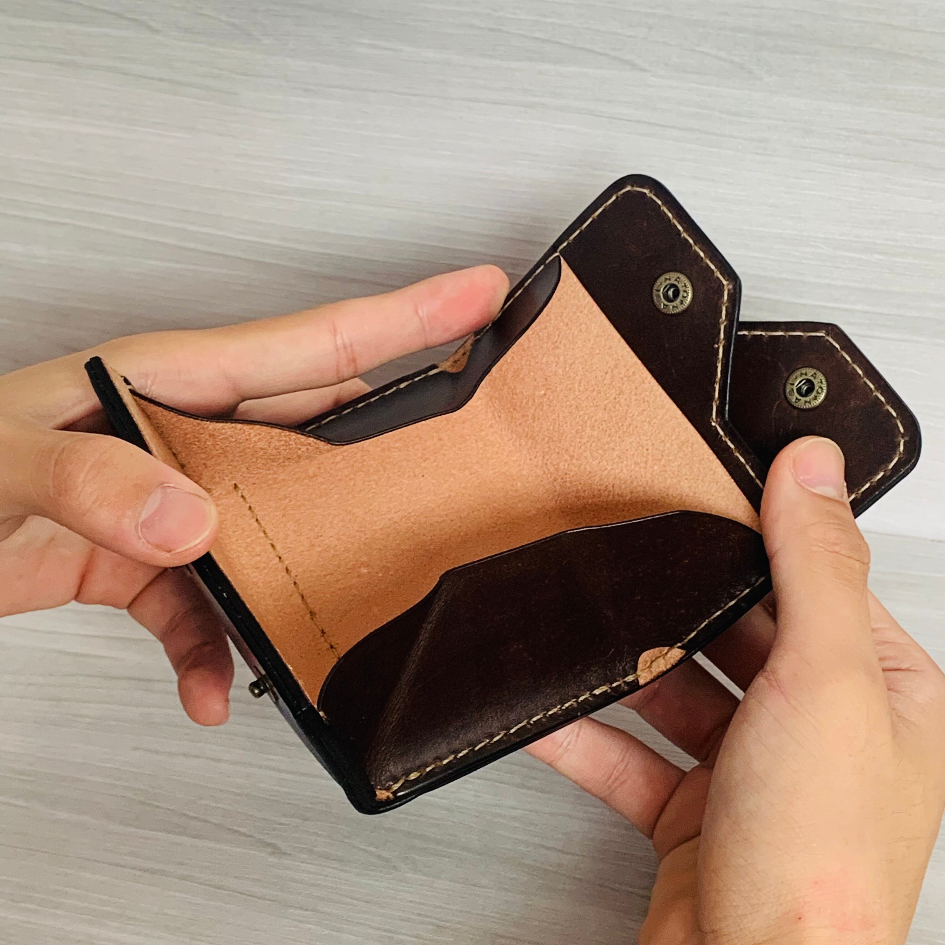 小銭入れは使いやすいボックスタイプで大きく開き、小銭での支払いもスムーズ。お札もしっかり収納可能で、フラップ部分を活用したT-woRks独自の形状です。カードポケット×3に加え、隠しポケット×1としっかりした収納力。